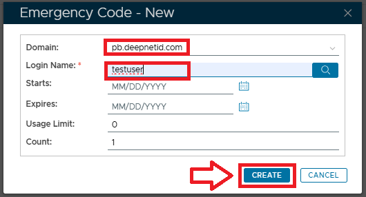 Specify the Domain and Login Name of the user that the Emergency code is to be issued to then click the
