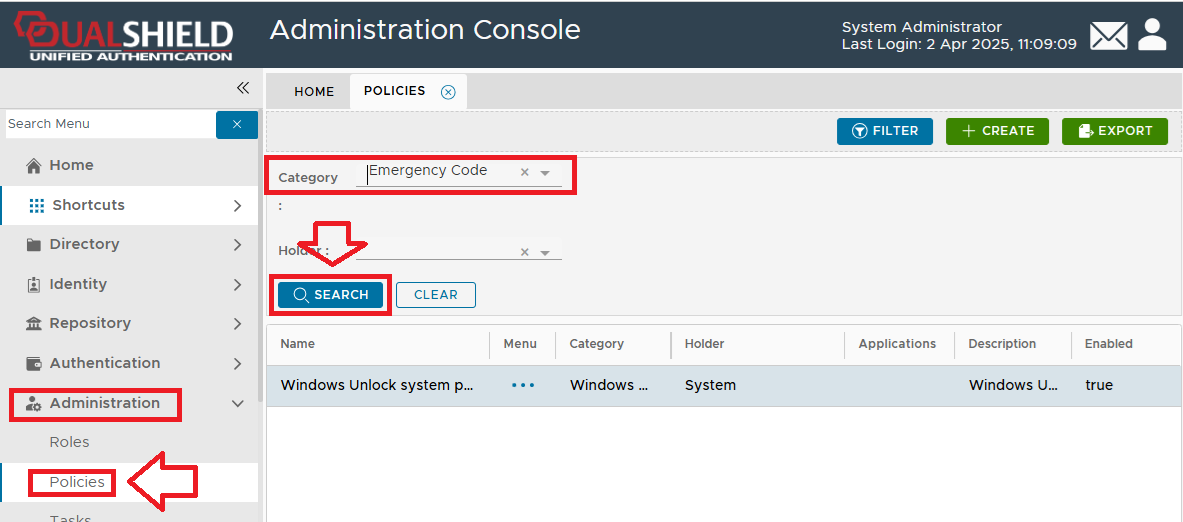 From the Home page of the Management Console, left click on the menu item "Administration", select "Policies", then in the new tab "POLICIES", select the category "Emergency Code", then click the
