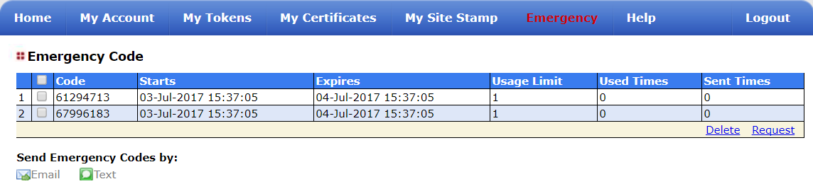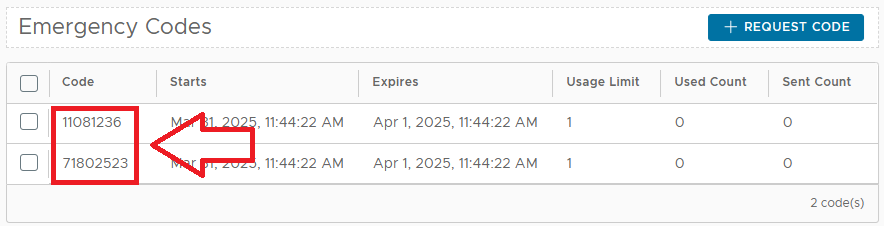 - It is also possible for emergency codes to be requested by the users themselves using the "Request" link (found in the bottom right hand corner of the "Emergency" menu option of the self-service console;