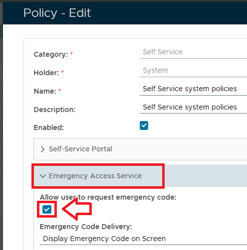 To allow users to generate emergency codes from within the self-service console, you will need to ensure that the feature is enabled in the self service policy using the following procedure;