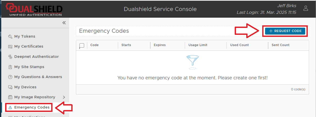 Emergency codes may be created either by using using the management console, or by the user themselves (after accessing the Emergency Access Service, or DualShield Service Console).