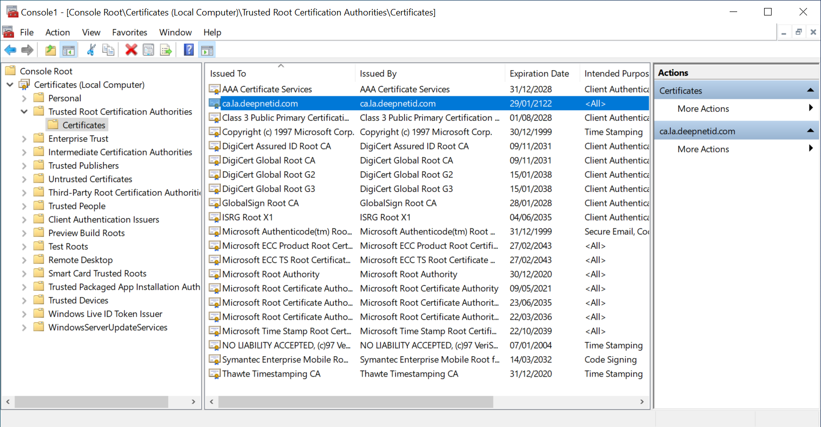 Import the Agent CA certificate into the Trusted Root Certificate Authorities on the DualShield MDM server.