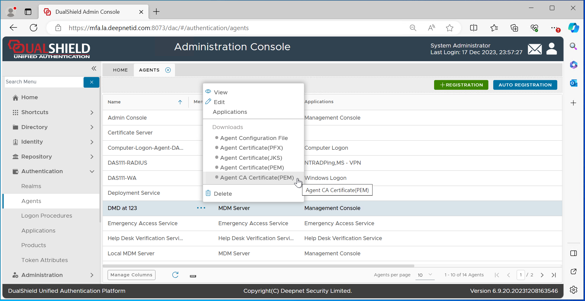 In the Admin Console, navigate to Authentication\Agent, and find the newly registered MDM agent, e.g. "DMD at 123". In the context menu of the agent, select "Agent CA Certificate"