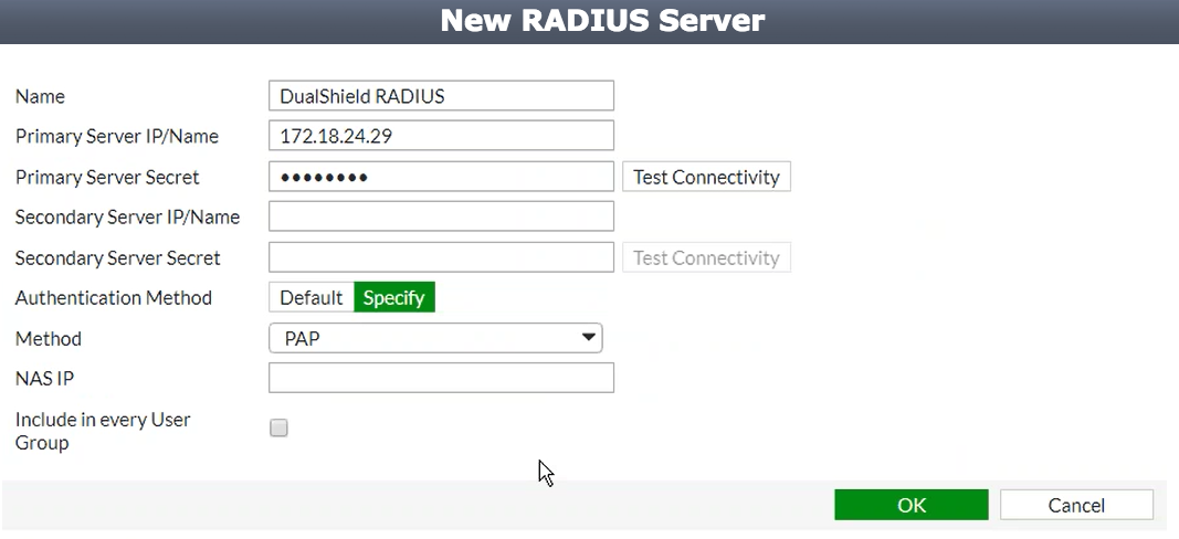 4. Click the Create New button in the Remote groups section and select the DualShield RADIUS remote server. You do not have to specify a group.