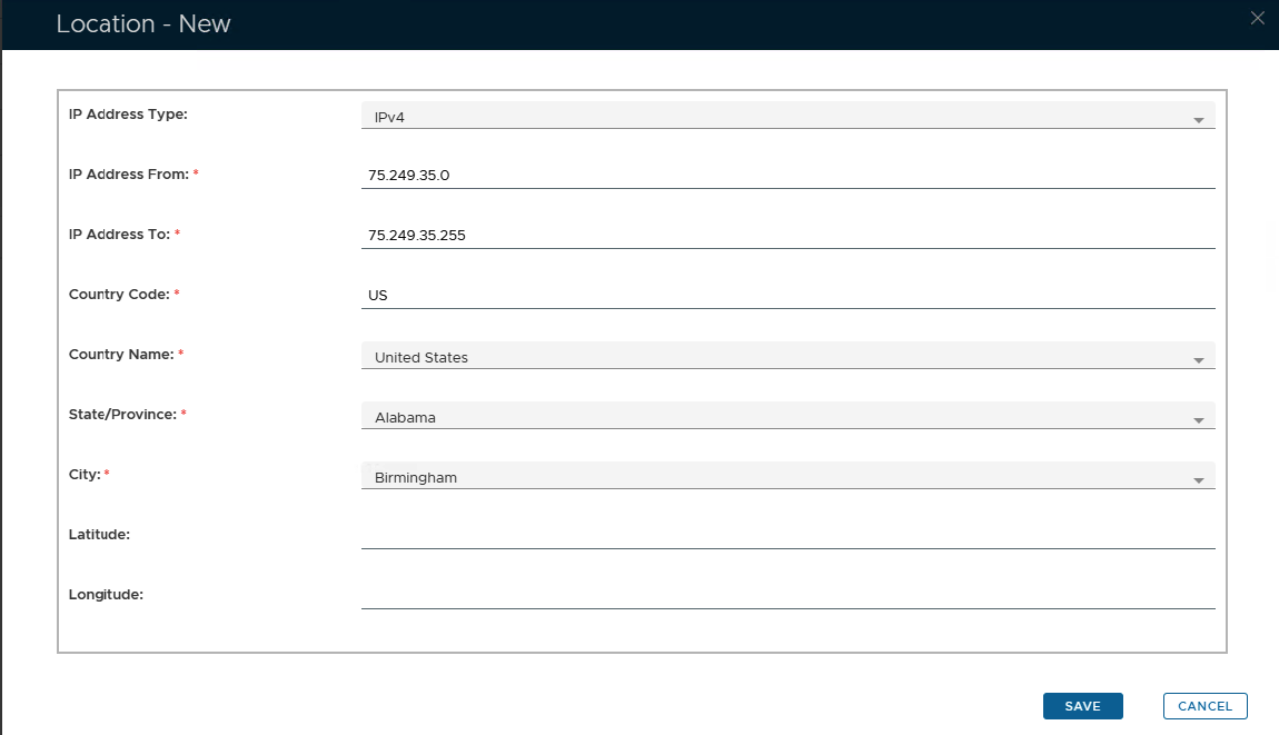 In the Location - New window you can set a customised IP address range, and apply it to the Country Name, State and City as per following example.