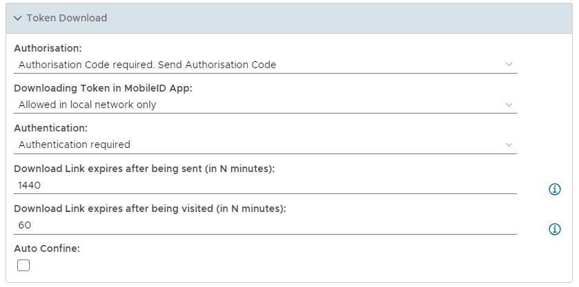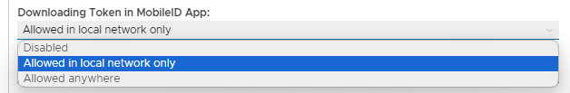 This option will specify if token downloading from the mobile app is to be allowed only from the network, from anywhere, or not at all;
