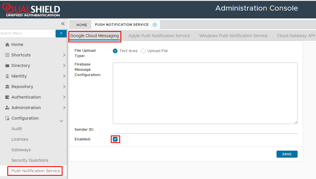 For customers using DualShield Authenticator Server version 6.5 and above, Google Cloud Messaging Service does not need to be set up. However, it is disabled by default. To enable it, navigate to "Push Notification Service | Google Cloud Messaging", and enable the option "Enabled"