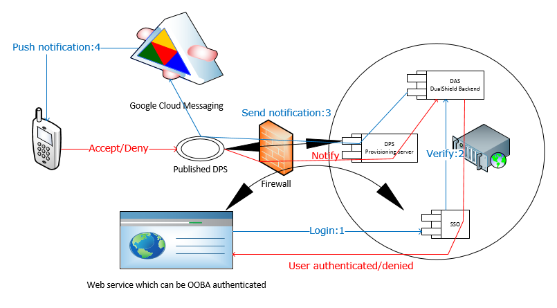 The blue lines tell you how the notification arrives on the user's mobile phone, while the red lines describe how your action of accept/deny reaches the web service that supports OOBA.