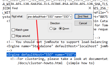 3) Edit server.xml in your preferred text editor and search for <Engine defaultHost="SSO" name="SSO">
