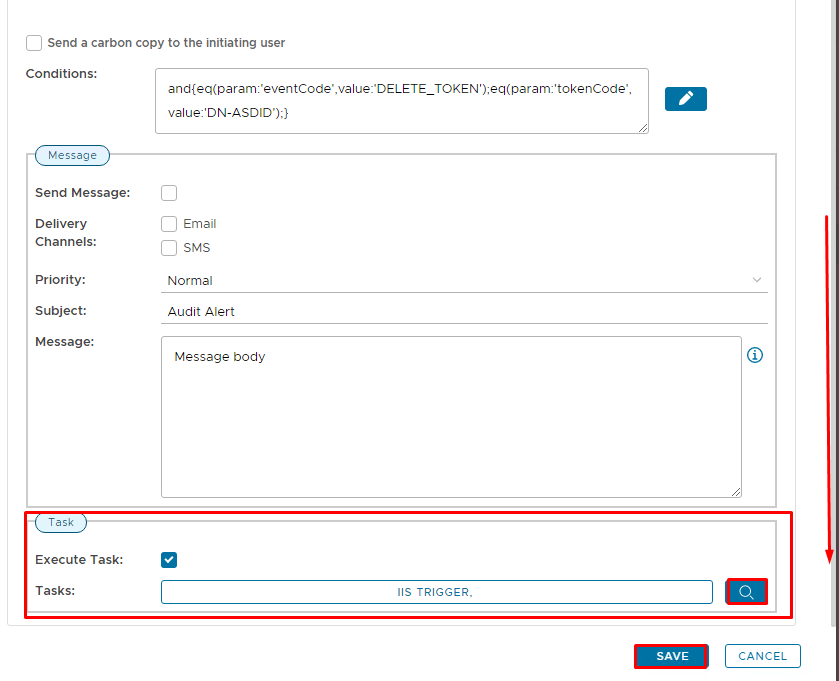 In this step, you will create an audit alert that will run the IIS Trigger task as soon as an audit log containing the event code Delete Token and the the token being the DeviceID token, is generated.