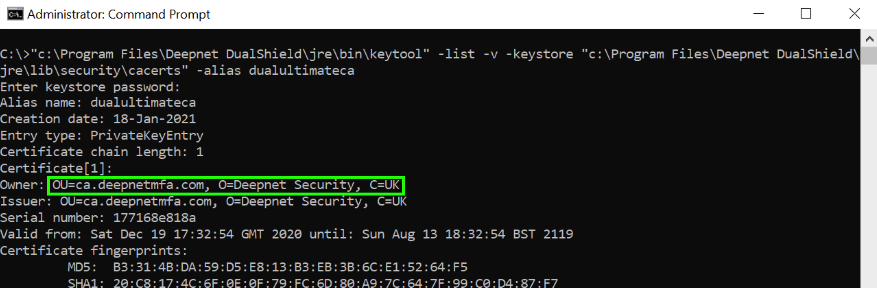 2) Note down the owner details. In this example, it is: OU=ca.deepnetmfa.com, O=Deepnet Security, C=UK