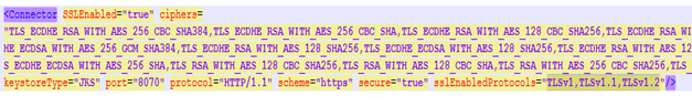 The file is in the sub-folder “\tomcat\conf”, and to make remove TLS 1.0 and TLS 1.1 you will need to first search for all instances of "SSLEnabledProtocols=";