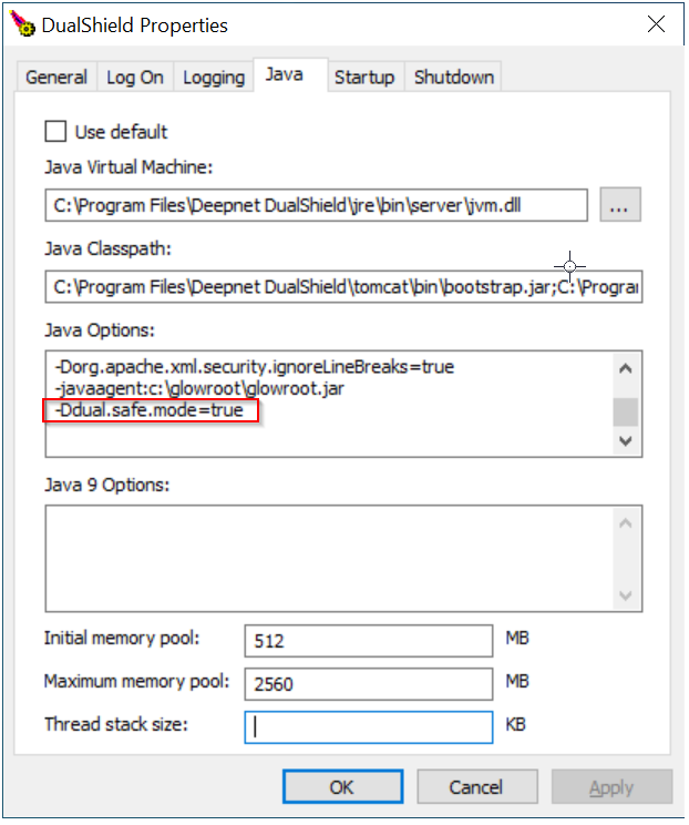 Change to the subfolder "tomcat\bin", then issue the command "Dir tomcat*.*"; Look for the file ending "w.exe", e.g. tomcat9w.exe, then issue the command "tomcat9w.exe //ES//dualshield " (replacing tomcat9w with the version found in your directory), A new window will open titled "DualShield Authentication Server Properties", select the tab "Java";