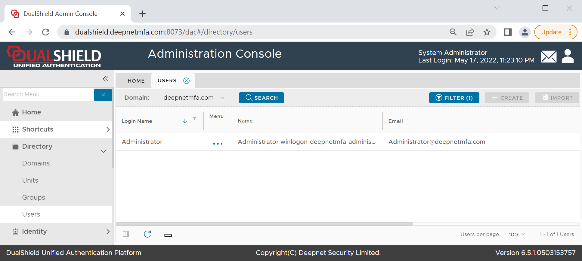 By default, the DualShield installer creates a default system administrator user called "sa". This is an internal user account managed by the DualShield server itself. You can create more internal user accounts for your admin or helpdesk team members who will be allowed to access the Admin Console, or you can allow your AD users to access the Admin Console.