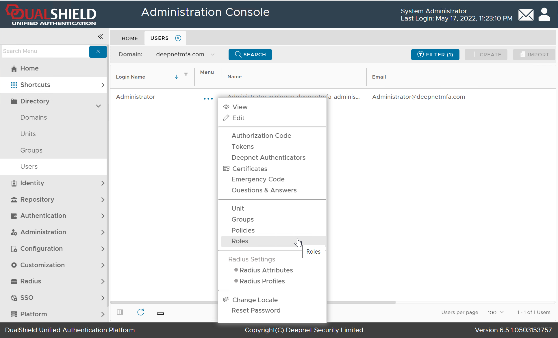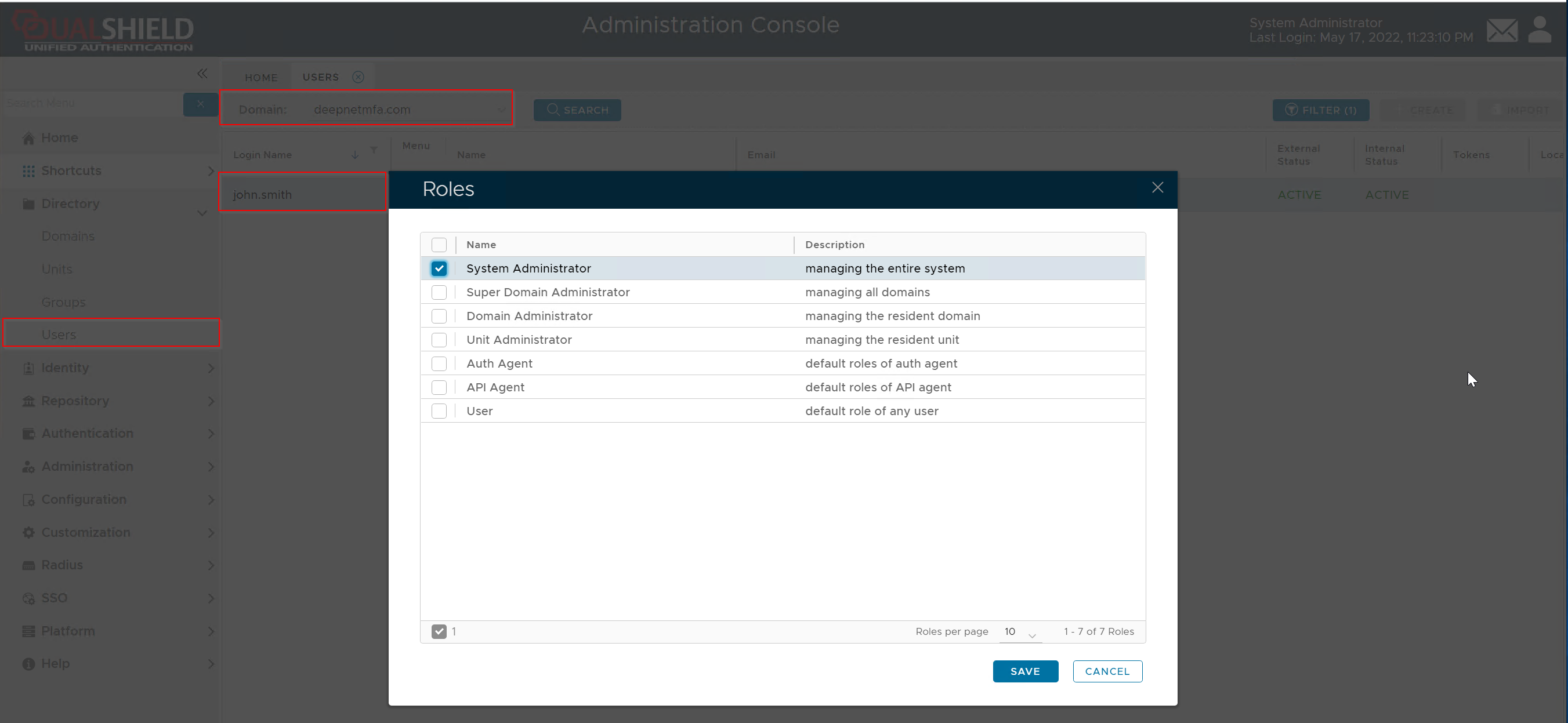 In the example below, a user called "John Smith" in an AD called "deepnetmfa,.com" is being assigned the "System Administrator" role