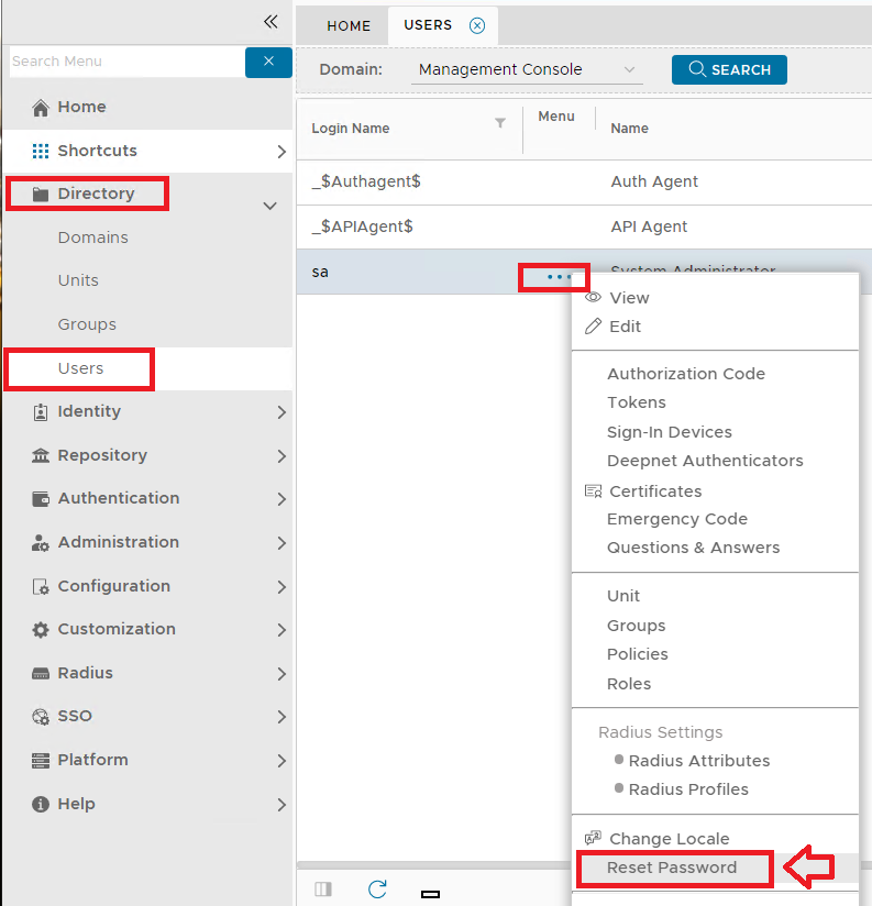 Navigate to "Directory | Users", select the Domain "Management Console", then left click the context menu of the user account "sa" and select "Reset Password";