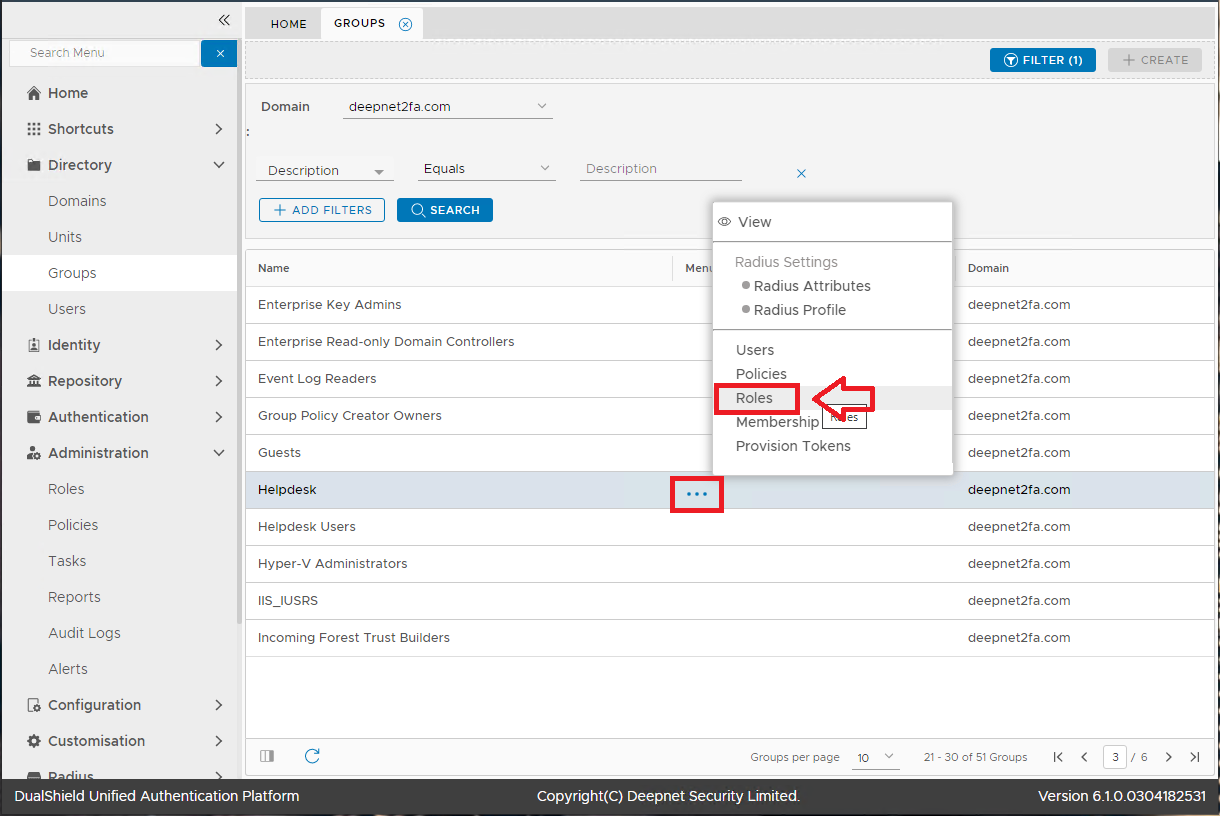 The helpdesk role can be applied to users by navigating to "Directory | Users", left clicking on the context menu of a user and selecting "Roles";