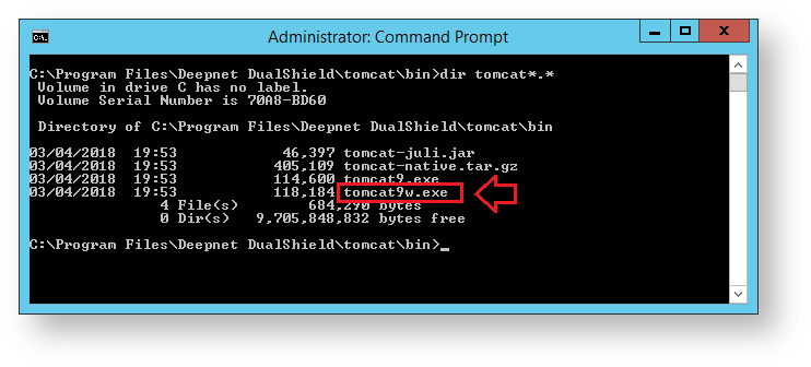 Look for the file ending "w.exe", e.g. tomcat9w.exe, then issue the command "tomcat9w.exe //ES//dualshield " (replacing tomcat9w with the version found in your directory),