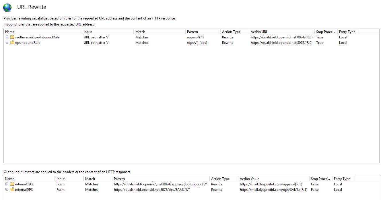 Insert the following rewrite rules, but make sure that you replace "dualshield.opensid.net" with the internal FQDN of your DualShield server, and "mail.deepnetid.com" with the external FQDN of your reverse proxy. You also need to change the line below