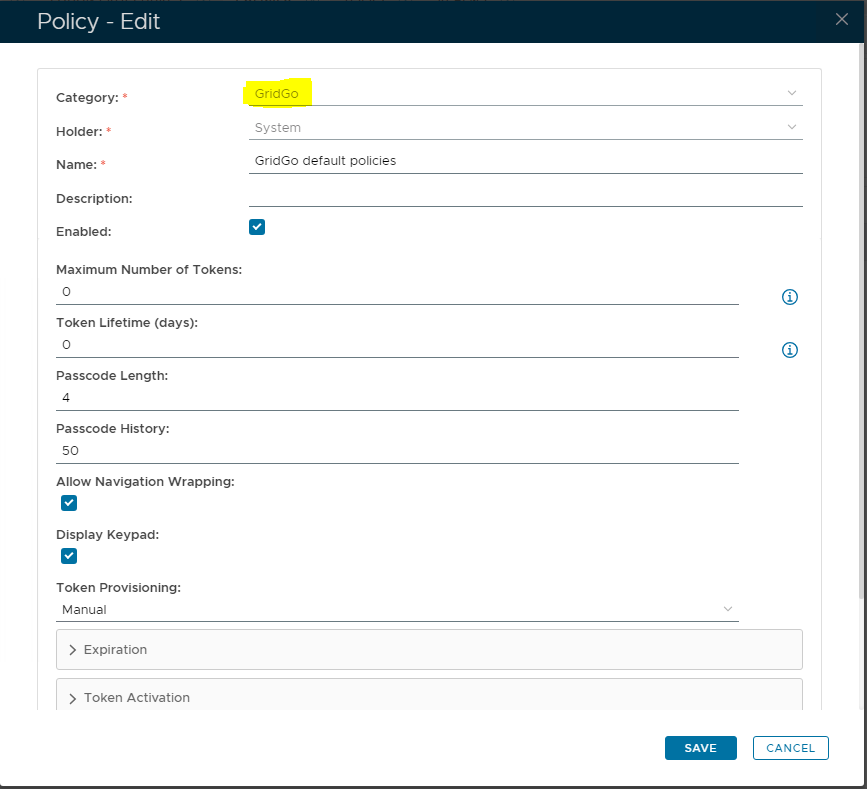 The category for this policy is "GridGo" (this property cannot be edited).