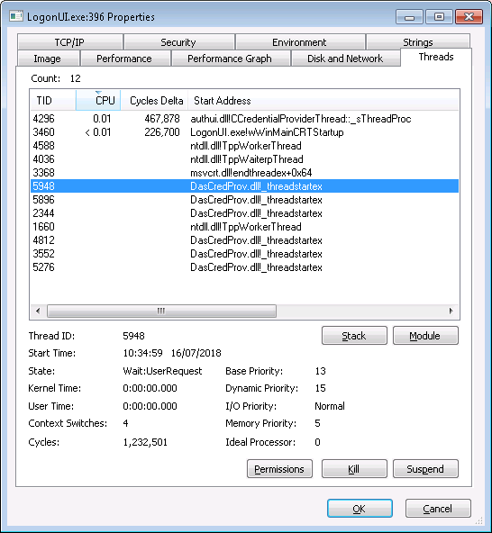 Right click it, choose Properties…, then tab Threads. You should see some threads with the name "DasCredProv.dll! ..."