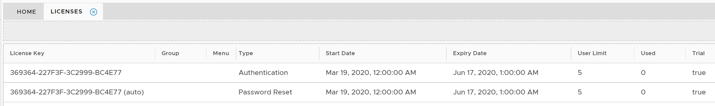 Once a license key has been successfully imported, you will actually get 2 licenses listed. One for Authentication and the other for Password Reset.