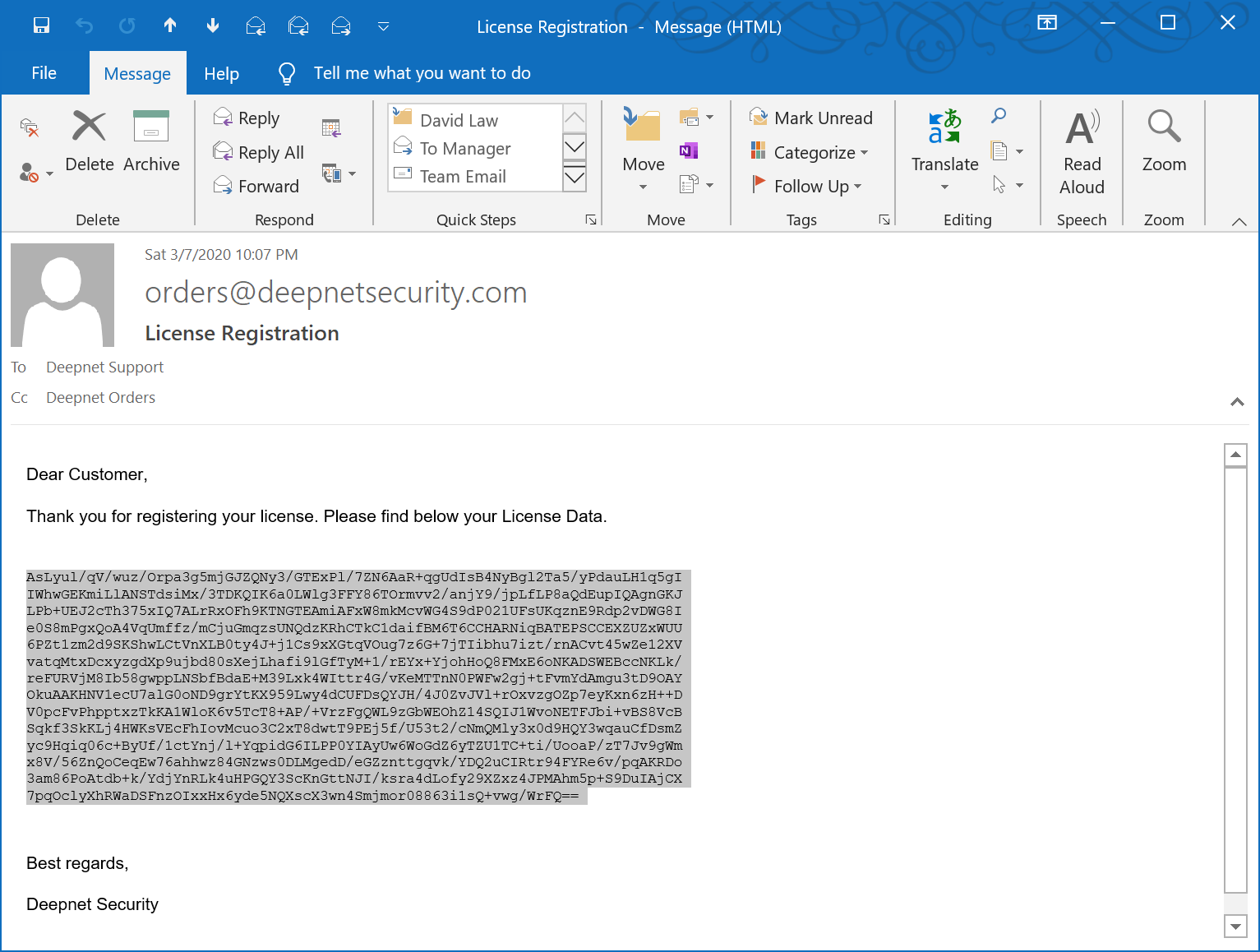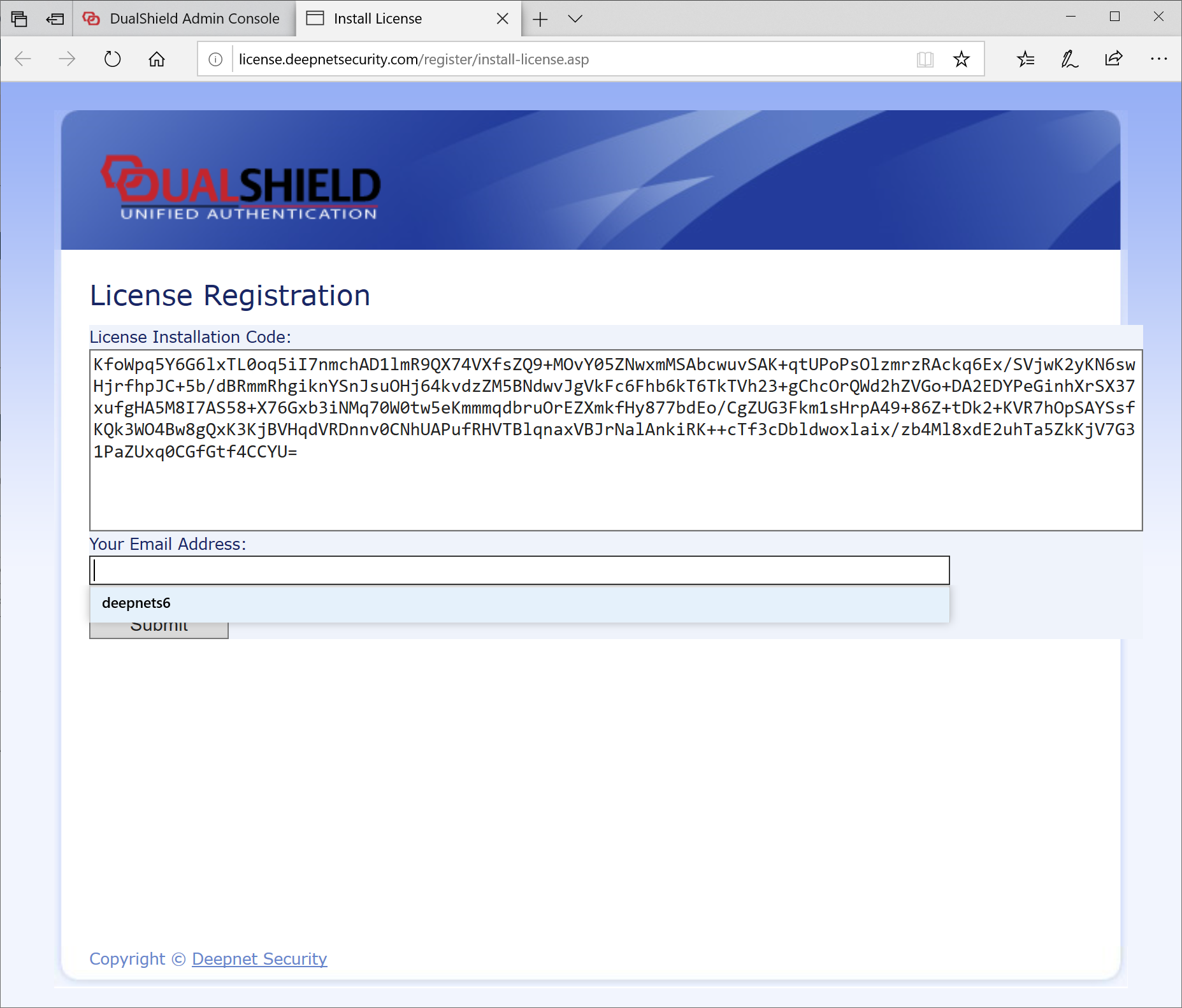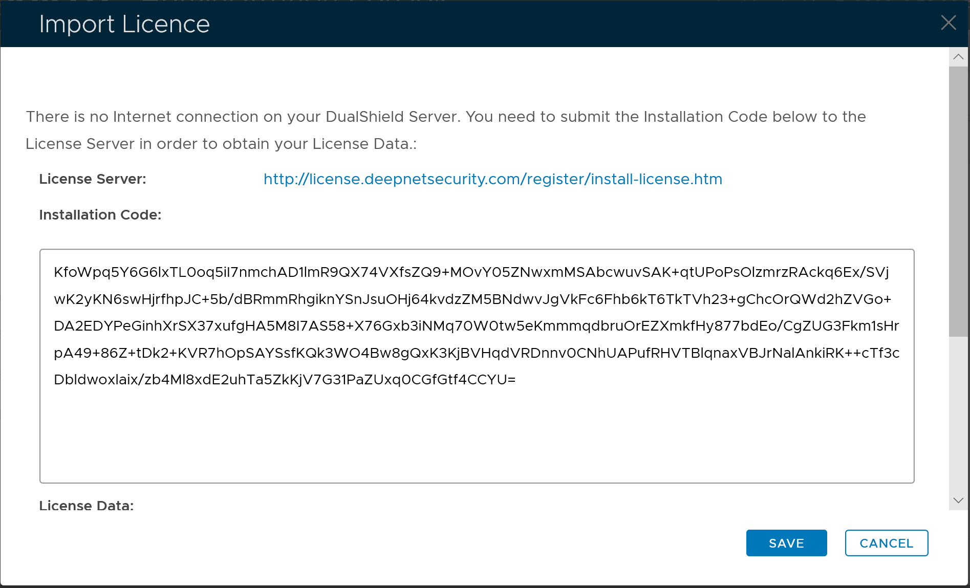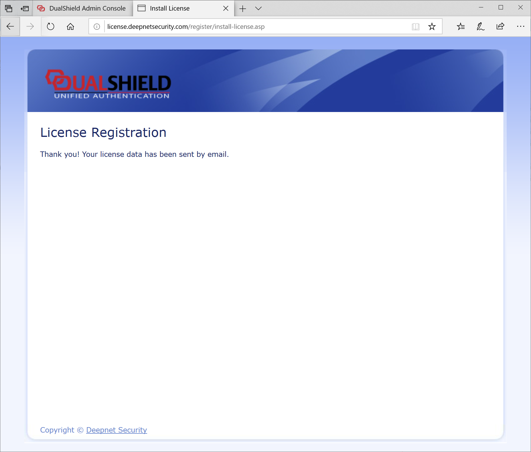 If the DualShield server machine has an Internet connection, then the license data will be automatically downloaded from the DualShield Licensing Server and saved into the DualShield server.