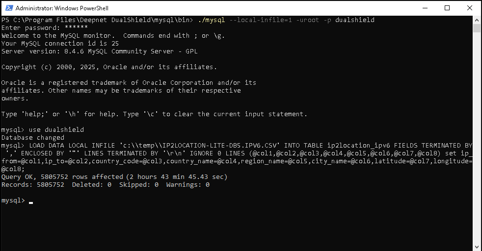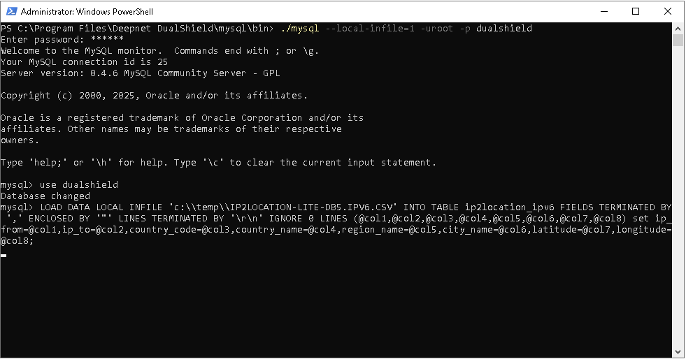 If your DualShield is using a MySQL database, follow the steps below to import "IP2LOCATION-LITE-DB5.IPV6.CSV"