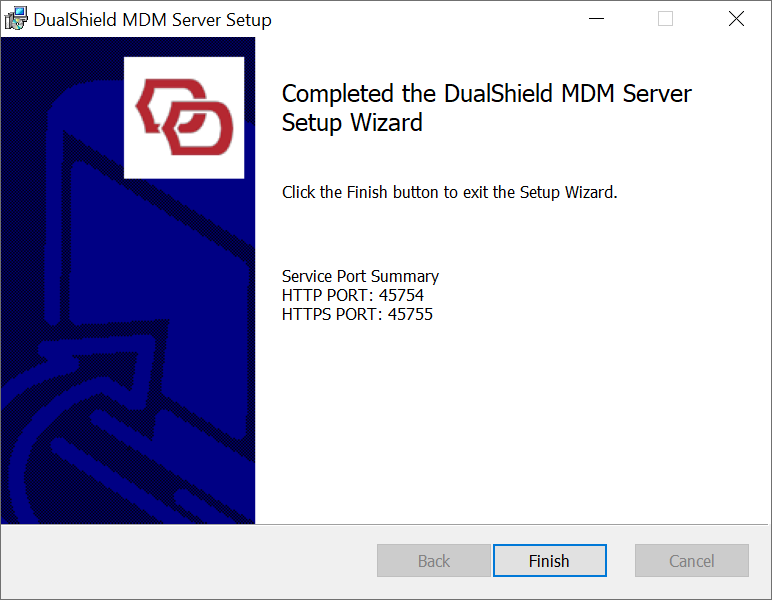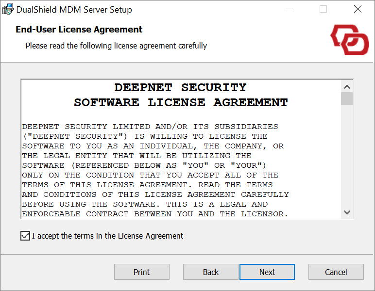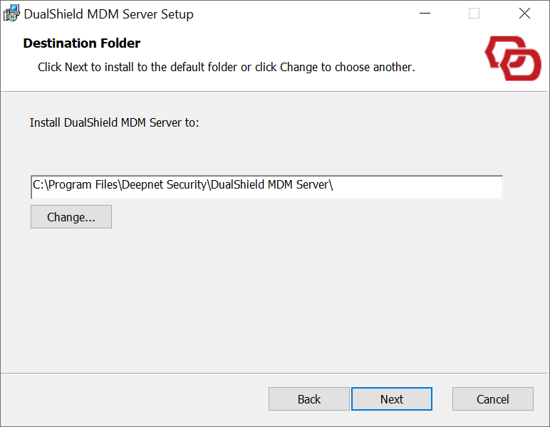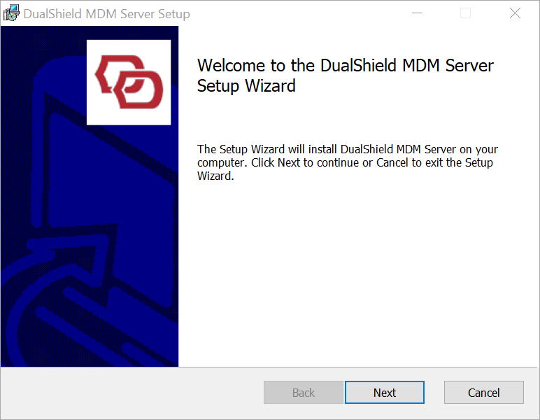 To install the DualShield MDM Server, launch its installer "DualShieldMdmServer.WindowsInstaller_nn.nn.nn" (in which "nn.nn.nn" is its version number), and go through the following steps: