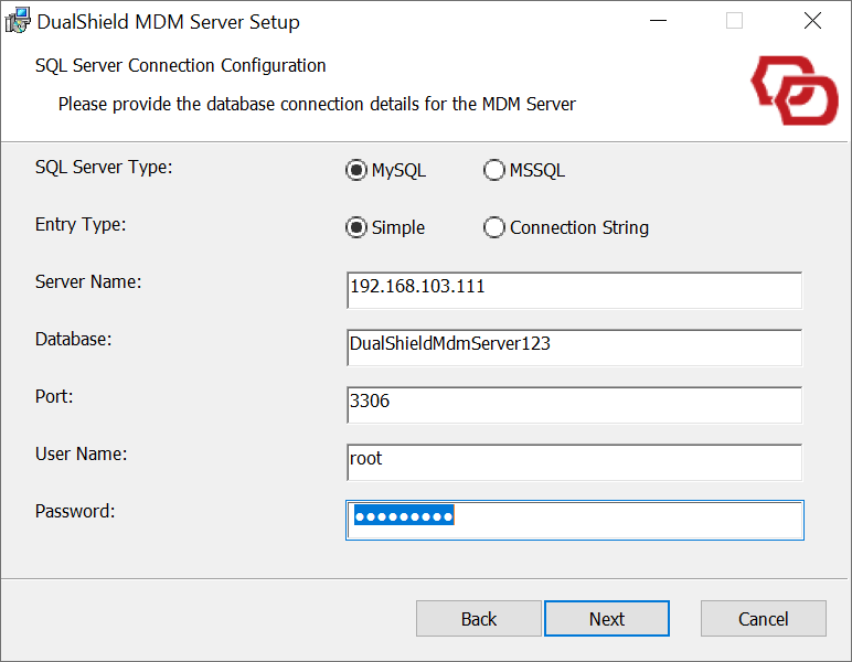 Typically, you would use the same SQL server used by your DualShield Authentication Server. In the example below, we're using the MySQL server at the IP address of 192.168.103.11 that is being used by a DualShield Authentication Server