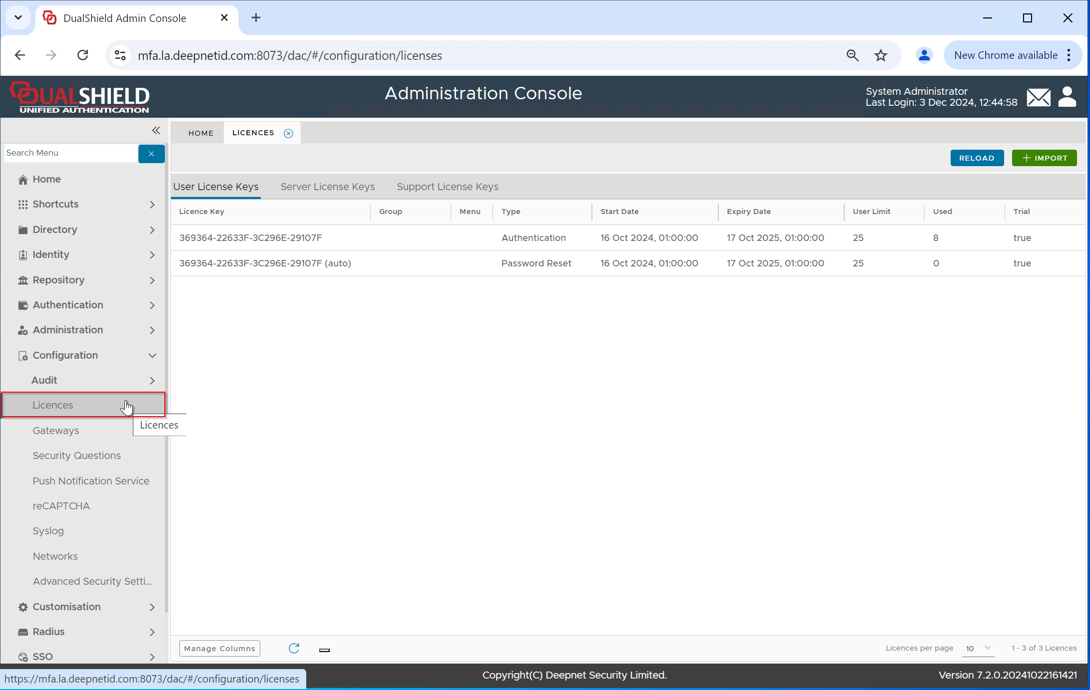 To check the details of license usage, navigate to "Configuration \ Licences" in the admin console: