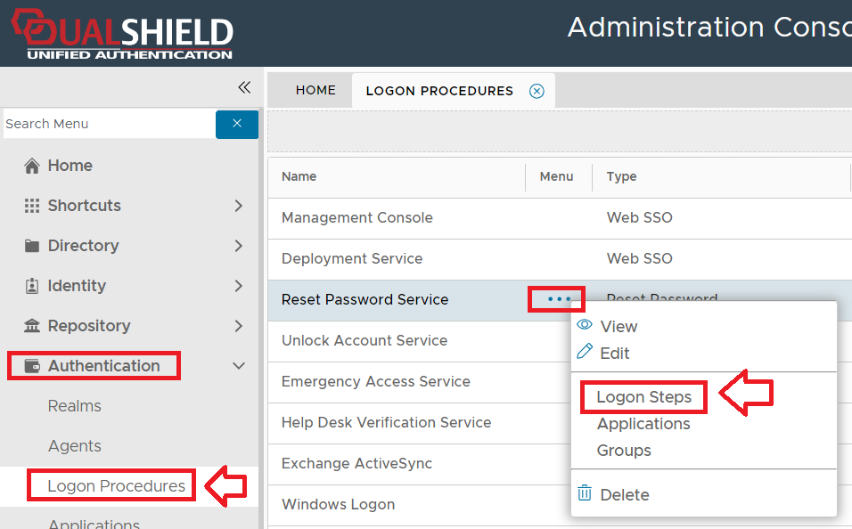 • From the Management Console, navigate to "Authentication | Logon Procedures" , and use the context menu of the logon procedure that will be protected with Microsoft Authenticator tokens (via OTP), and select "Logon Steps";
