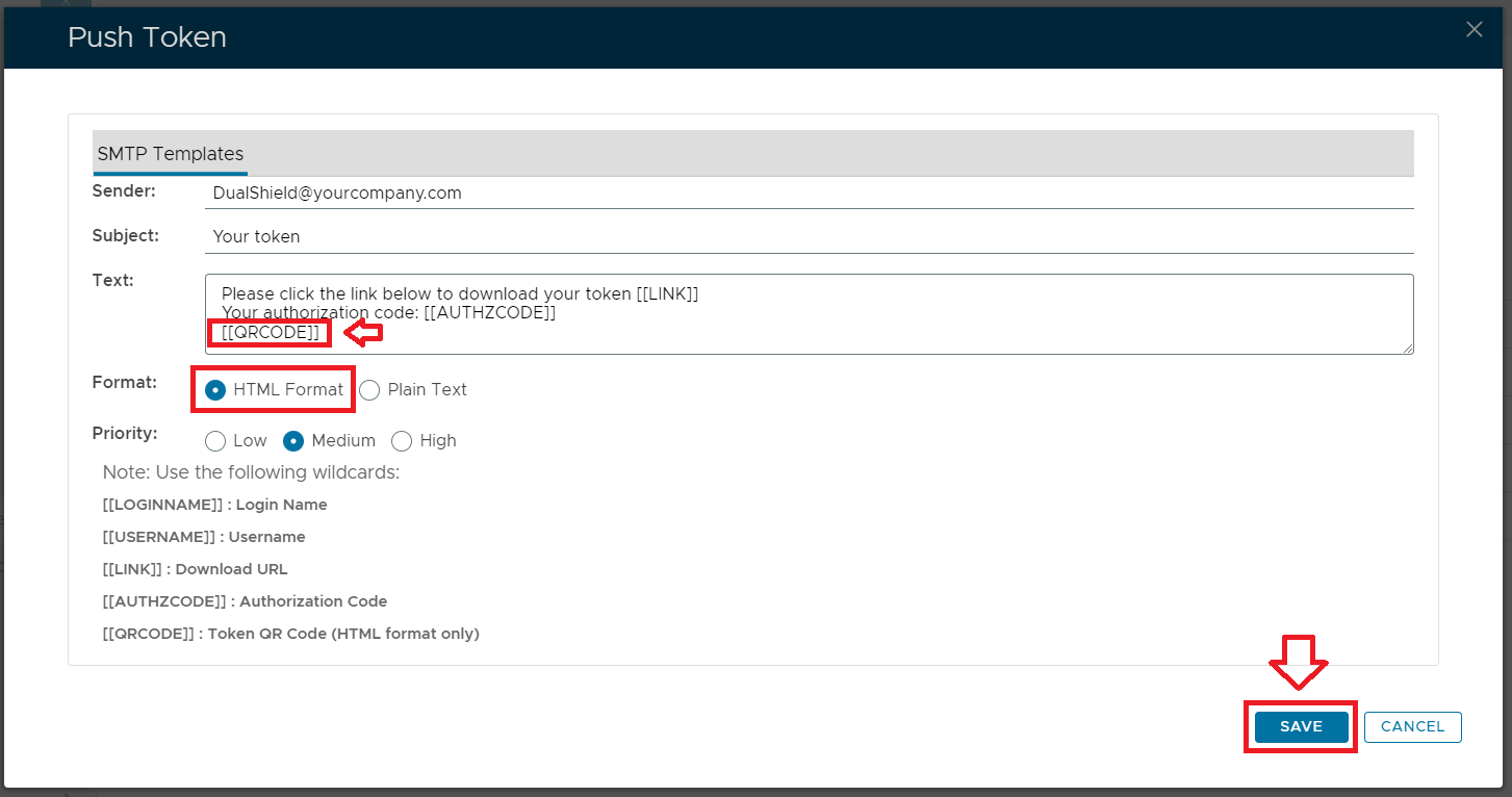 A new window titled "Push Token" will now open, at the prompt "Text:" add the text "[[QRCODE]]", at the prompt "Format:" select "HTML Format", then click ;
