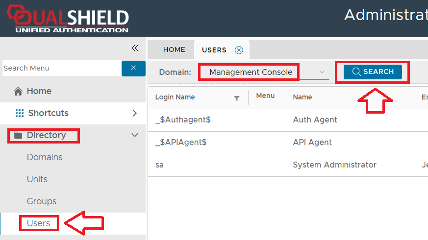 • From the management console, navigate to "Directory | Users", select the domain "Management Console" and click "SEARCH";