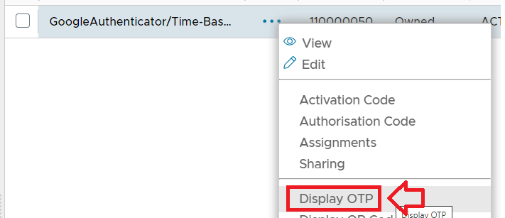 If we now switch back to our management console window and navigate back to our list of tokens assigned to the newly created user, we can use the context menu option "Display OTP";