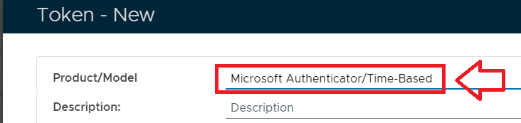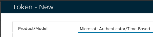 Click the button, and a new window titled "Token - New" will open, at the prompt "Product/Model" select "Microsoft Authenticator/Time-Based";
