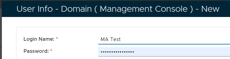 A new window will now open titled "User Info - Domain (Management Console) - New", fill in the Login Name of "MA Test", and supply a password to be used for this test account;