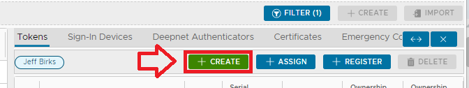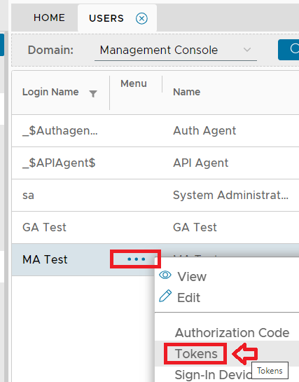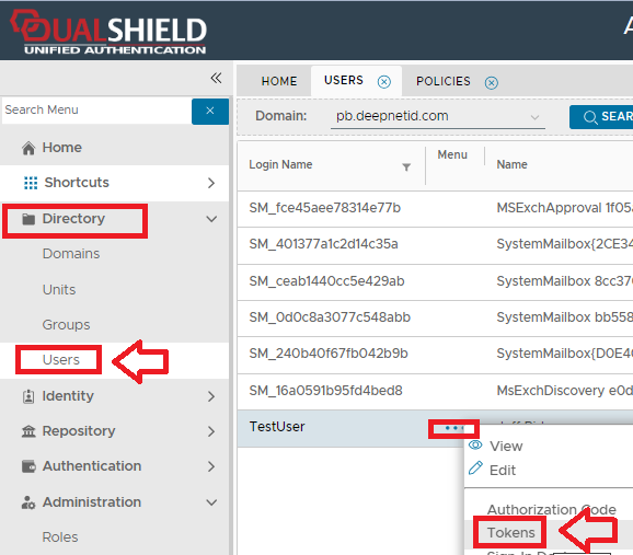 1. From the management console navigate to "Directory | Users", left click on the context menu of the user you need to provision a token to then select "Tokens";