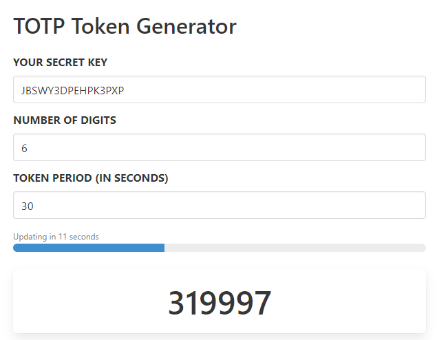 To test the token we navigate to an online TOTP Generator (a good example is https://totp.danhersam.com/) , and copy and paste in our seed into the generator.
