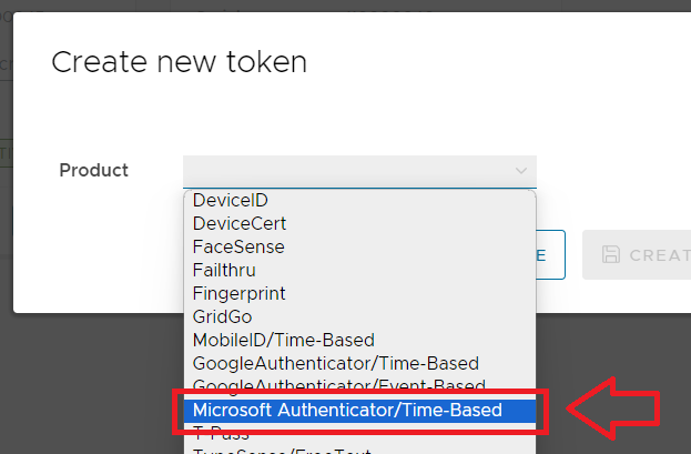 A new window titled "Token - New" will now open, at the prompt "Product/Model" select "Microsoft Authenticator/Time-Based" then click ;