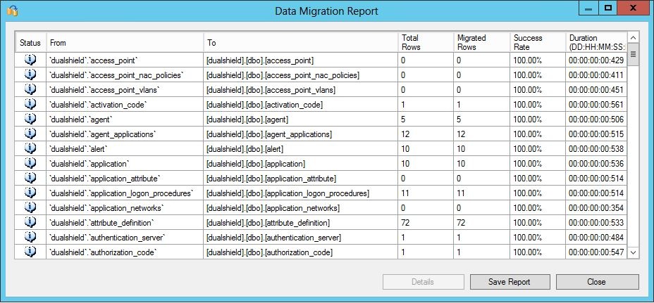 Head back to the SSMA tool and ensure that the dualshield database is still selected in the "MySQL Metadata Explorer". Then select the button from the tool bar. You will be prompted to re-connect to both databases again, use the same credentials for both that were used in the previous stages. After connecting again, the tool will start the data migration into the new modified SQL schema we have setup already. You will see a lot of console text cycle in the Output window, wait until you a new window appear called "Data Migration Report". Check through the list and ensure you receive a 100% Success rate for all tables before continuing. E.g.