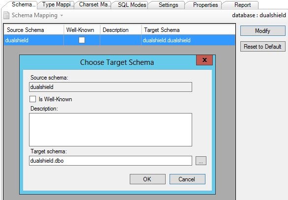 Now with the "Schema Mapping" tab selected, click the "Modify" button. On the new popup "Choose Target Schema" window, modify the "Target schema" line to be dualshield.dbo and click "OK" to save. E.g.