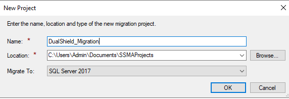 Load up the SSMA for MySQL and start by creating a new project from the "File" menu. Select your destination SQL server version from the "Migrate To" drop-down menu. For this guide, "SQL Server 2017 (Windows) - Preview" has been used.