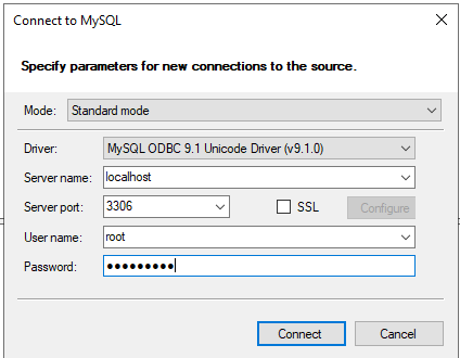Once that is done, Click the button at the top of the window. The connection dialog box for MySQL will appear, fill out the appropriate connection details of your existing MySQL server.