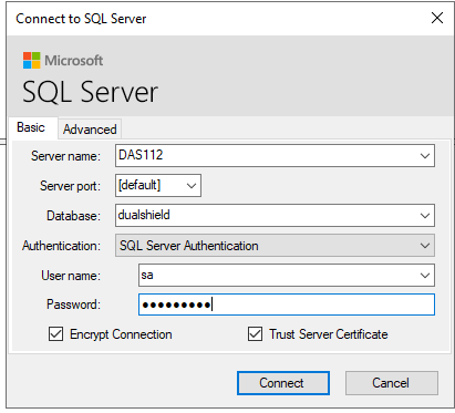 Load up your management studio software on your SQL database server and connect to the SQL server where the dualshield database was created earlier.