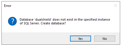 You may also get the following error message when connecting. Go ahead and click "Yes" so the target Dualshield database will be setup.