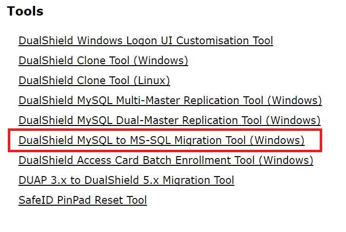 This article explains how to migrate a current installation of DualShield using a MySQL installation over to using Microsoft SQL Database. Some external tools must be installed before starting this procedure, links are below for these required tools.