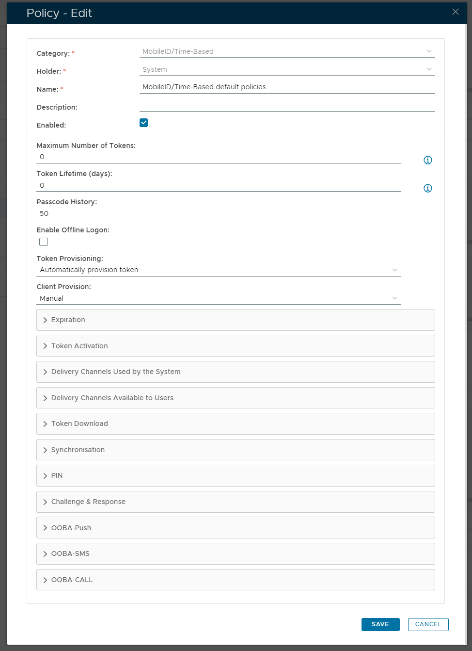 The policy can be found by navigating to "Administration | Policies", then scrolling down to the policy "MobileID/Time Based default policies";