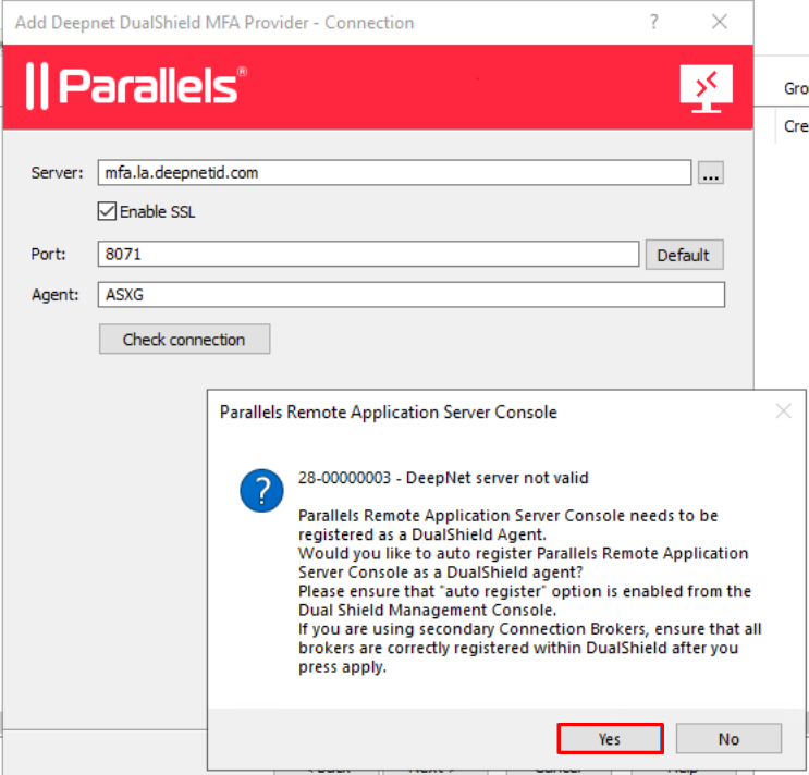 9. IMPORTANT: IGNORE 'DEEPNET SERVER NOT VALID' MESSAGE. Just click Yes heand the DualShield 2X Agent will be registered.