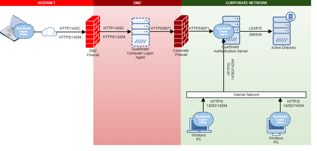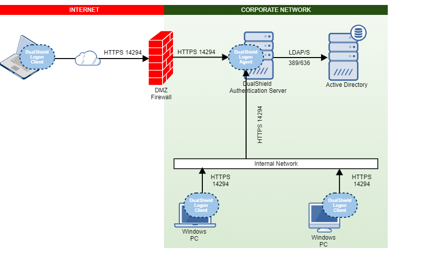 | 14294 | HTTPS | Communication between DualShield Logon Client and DualShield Logon Agent | Secure SSL |